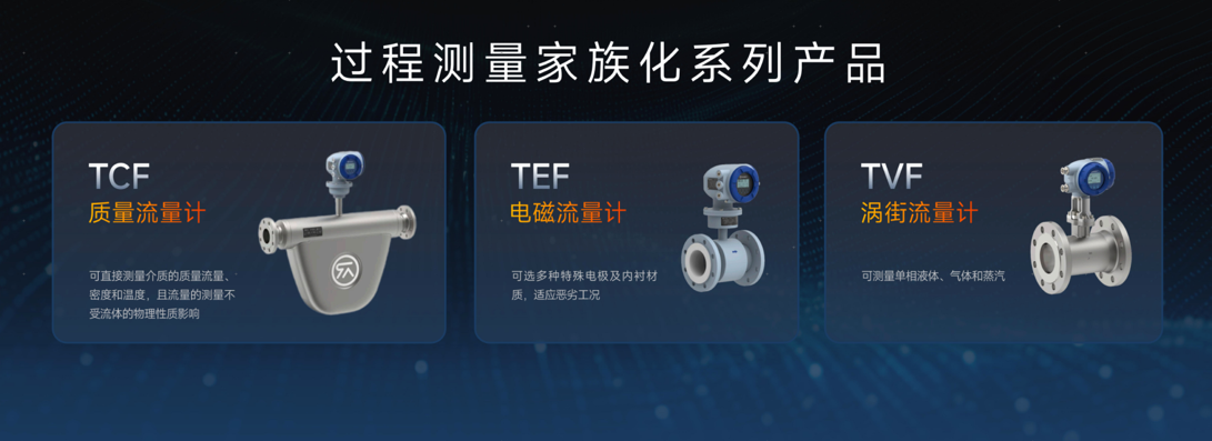 過程測量新產品:TCF質量流量計、TEF電磁流量計、TVF渦街流量計。以“多場景適配、高精度覆蓋”為核心優勢,形成從常規壓力到超高壓、從氣體到液體的全產業鏈計量矩陣。